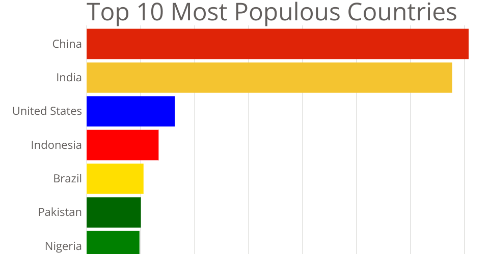 This bar chart shows population of the top 10 most populous countries. The data is sourced from 2018 estimate from the link: https://esa.un.org/unpd/wpp/download/standard/population/