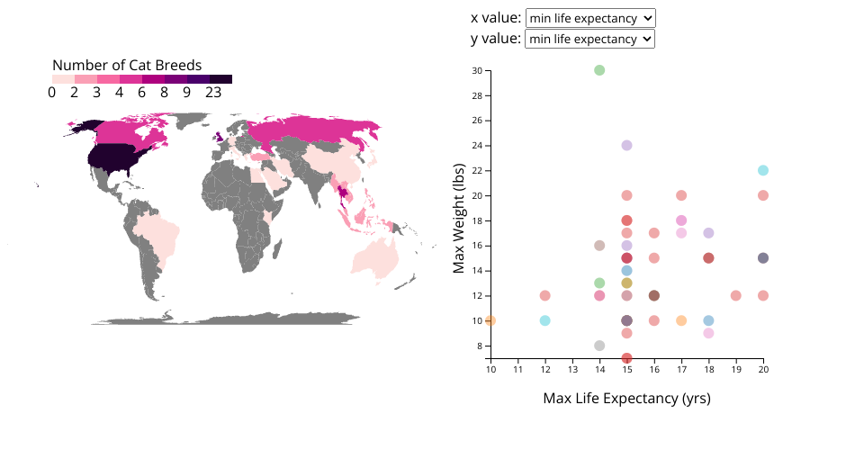 On the left is a world map with countries colored based on the number of cat breeds. This world map is zoomable and pannable using pinches and drags. On the right is a scatterplot of cat breeds graphed based on their max life expectancy and max weight.