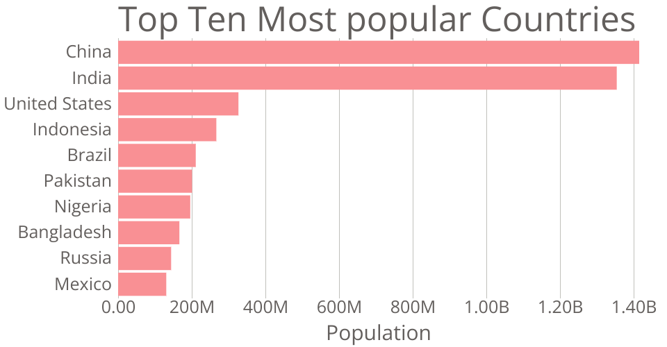 This bar chart shows population of the top 10 most populus countries. The data comes from the year 2018 estimate in World Population Prospects 2017
