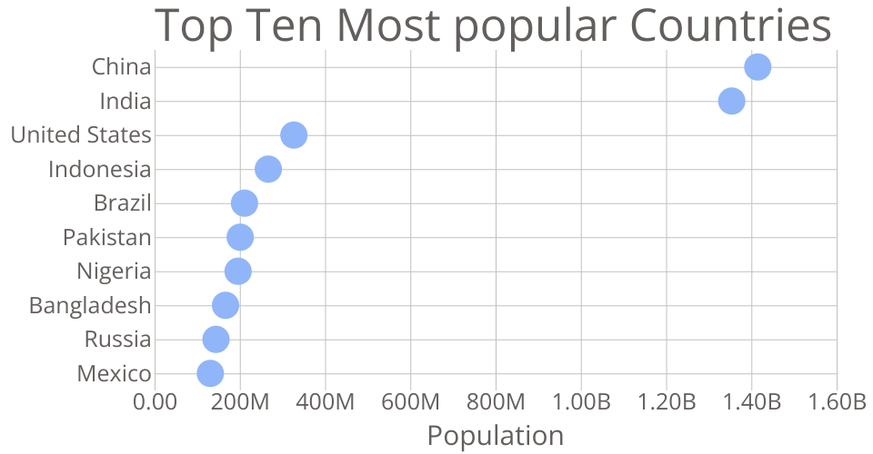 This bar chart shows population of the top 10 most populus countries. The data comes from the year 2018 estimate in World Population Prospects 2017