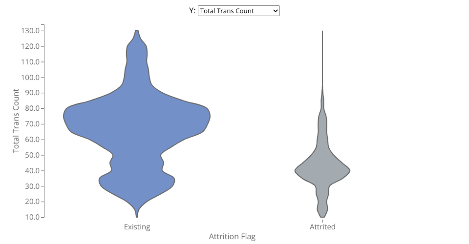 Finally, the attrition status of the customers is encoded on the color of the violins, the users can highlight the violins by hovering over them and see the values used to construct them on the tooltip.