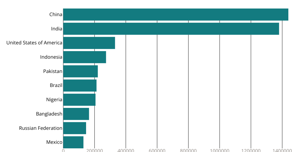 A program that shows the top 10 most populous countries as a pathetic bar chart with no axes.