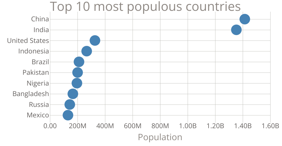 This bar chart shows population of the top 10 most populous countries. The data comes from the year 2018 estimate in United Nations: World Population Prospects 2017. It also demonstrates customization of D3 axes.