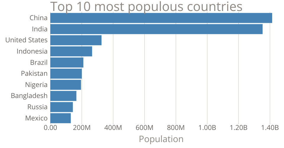 This bar chart shows population of the top 10 most populous countries. The data comes from the year 2018 estimate in United Nations: World Population Prospects 2017. It also demonstrates customization of D3 axes.