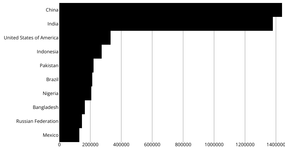 A program that shows the top 10 most populous countries as a pathetic bar chart with no axes.