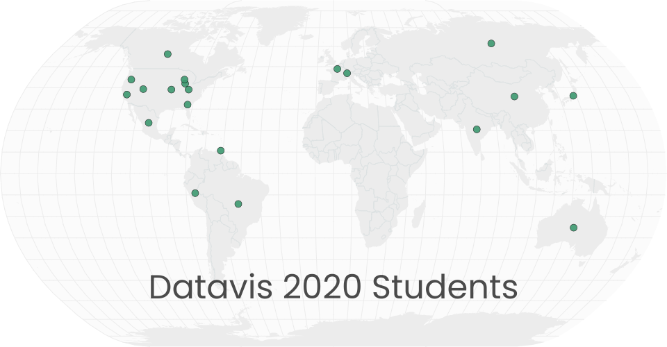 This map shows approximate locations of the students who joined Datavis 2020 in its first few days.