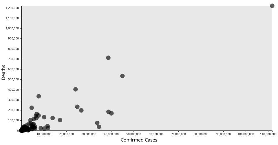Note that there is 1 very large outlier, with over 110,000,000 confirmed cases and 1,200,000 Deaths