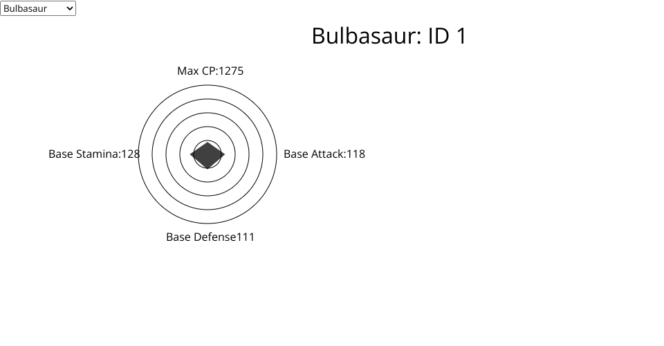 This week, I decided to skip ahead to Week 4's tasks. Now, there is a dropdown menu where you can select a pokemon based on it's name. This dropdown menu populates with all pokemon names in the pokemon.csv file. In addition, I removed one extreme outlier (Eternatus, ID = 890) from the pokemon.csv, due to it's extremely high Max CP. I cleaned up the existing code to be slightly easier to work with in my opinion. Lastly, I solved the redraw bug that I had last week, as well as a bug related to the radar chart not drawing properly that I did not know about, which is part of the reason I decided to implement the dropdown menu this week. For next week, I hope to implement the Weaknesses/resistances & move pools, which should add some color to the visualization (I know that was this weeks assignment, but I felt this was more important to complete this week).