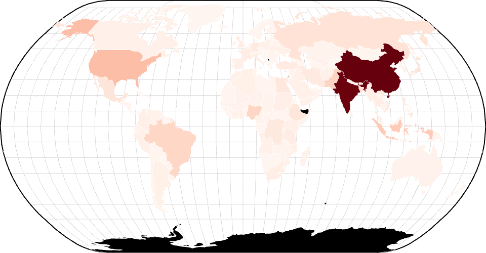 A basic world map, showing higher world populations as a deeper red.