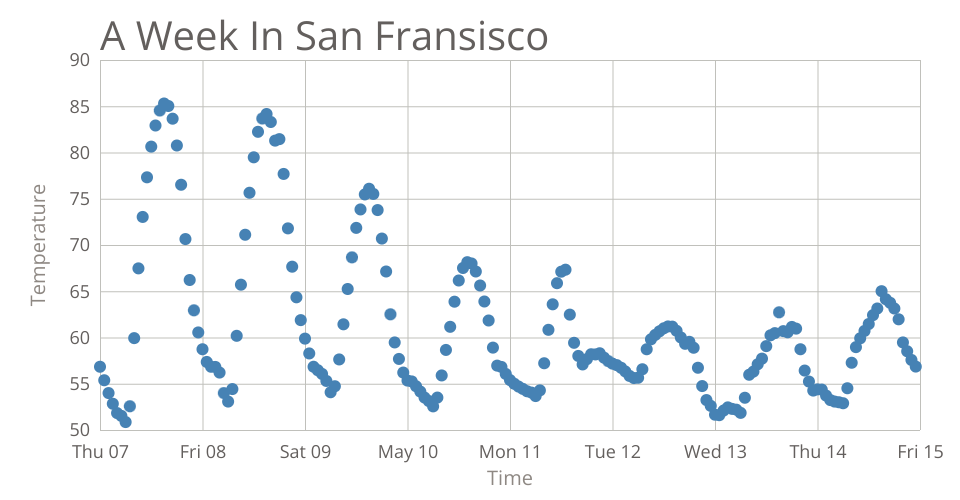 This scatterplot shows one week of temperature in degrees Farenheit.