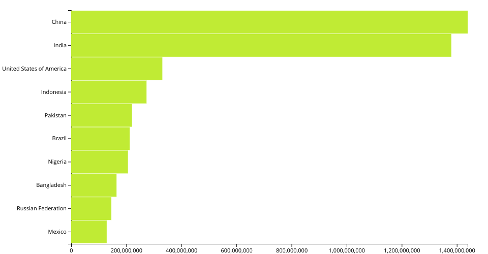 This bar chart shows population of the top 10 most populous countries. The data comes from the year 2018 estimate in United Nations: World Population Prospects 2019.