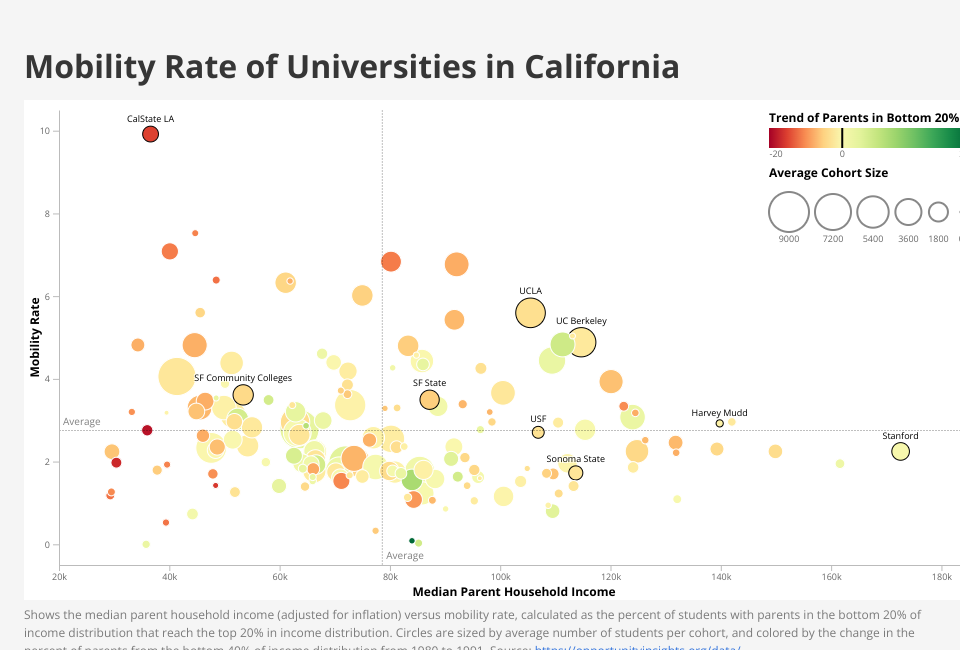 Median Parent Household Income vs. Mobility Rate. Color shows details about Trend of Parents in Bottom 20%. Size shows details about Average Children per Cohort. The marks are labeled by College Name. The data is filtered on State, which keeps CA.