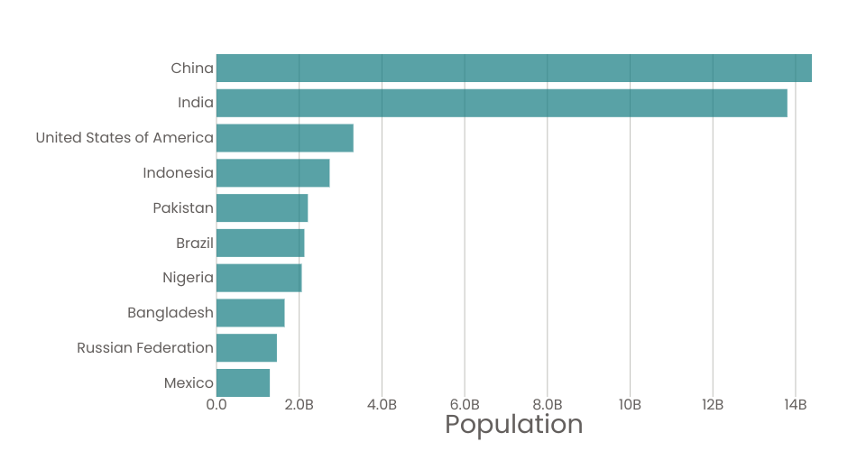 A program that shows the top 10 most populous countries as a pathetic bar chart with no axes.
