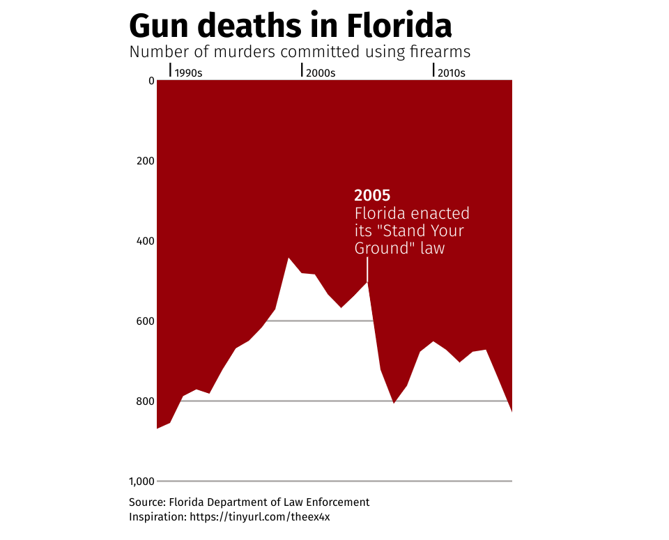 The original visualization appeared in the article This Chart Shows An Alarming Rise In Florida Gun Deaths After 'Stand Your Ground' Was Enacted article by Pamela Engel on Business Insider on February 18, 2014.