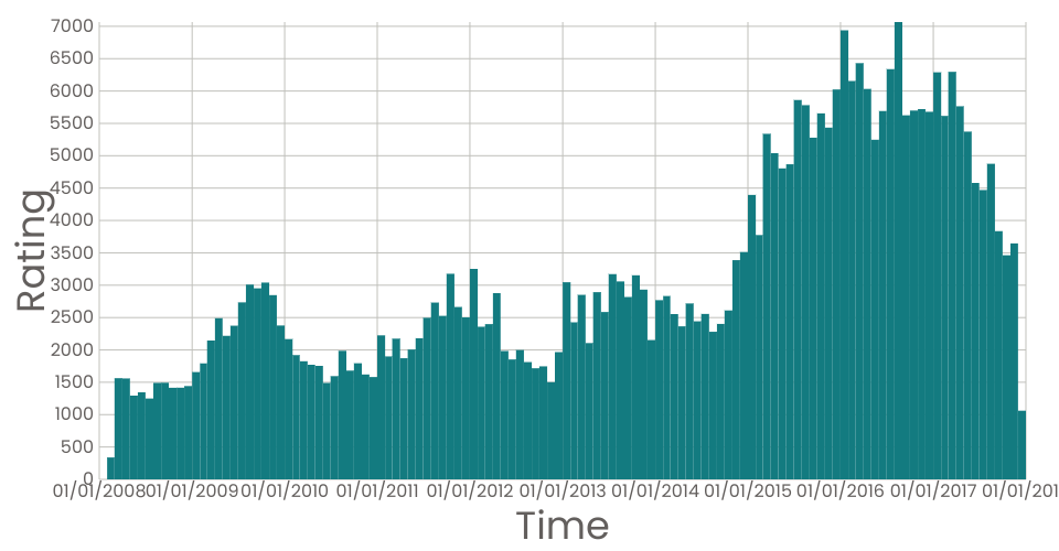 A date histogram showing the sum total of Drug Ratings for each month.
