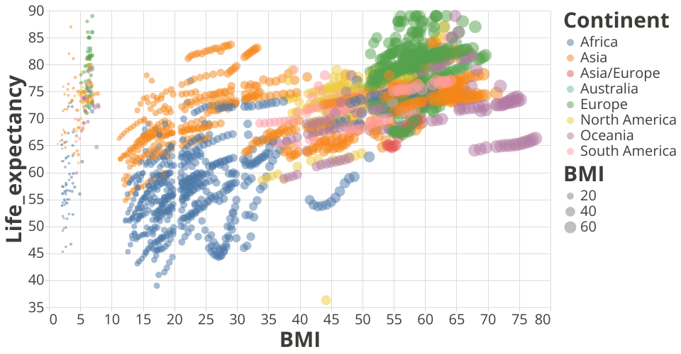 This visualization plot shows the Life expectancy of people in various parts of the world and the average BMI over a period of 15 years.
