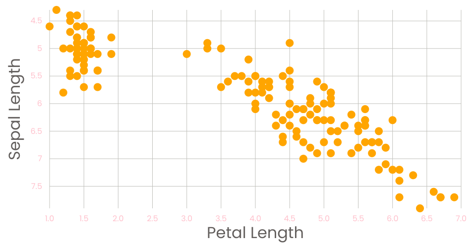 A scatter plot showing the Iris dataset and the relationship between Petal Length and Sepal Width (adaptable to any variable) using D3 and React.