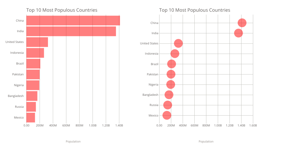 This bar chart shows population of the top 10 most populous countries. The data comes from the year 2018 estimate in United Nations: World Population Prospects 2017. It also demonstrates customization of D3 axes.