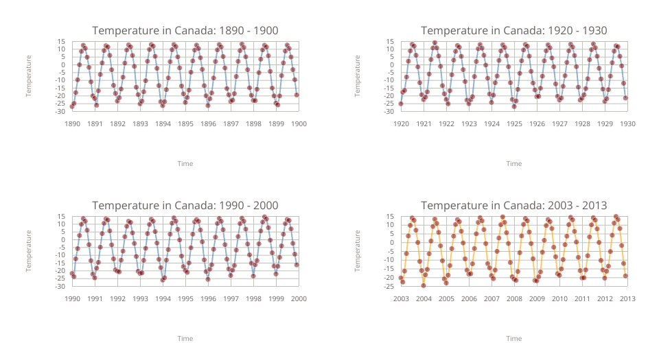 This line chart shows temperature (in degrees Celcius) in Canada over years. The data comes from [https://data.world/datasets/world]