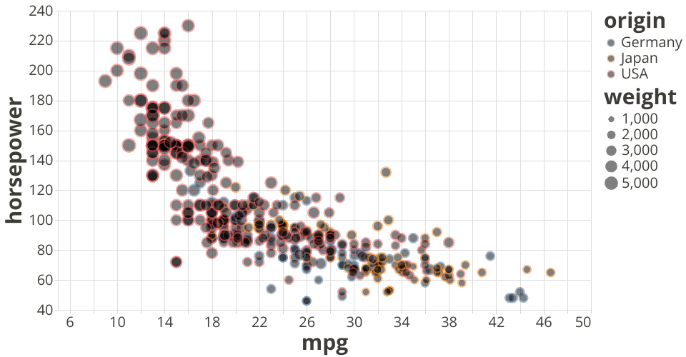The data shown here comes from the UCI Machine Learning Repository: Auto MPG Data Set, via Gist: Scatter Plot with Menus.