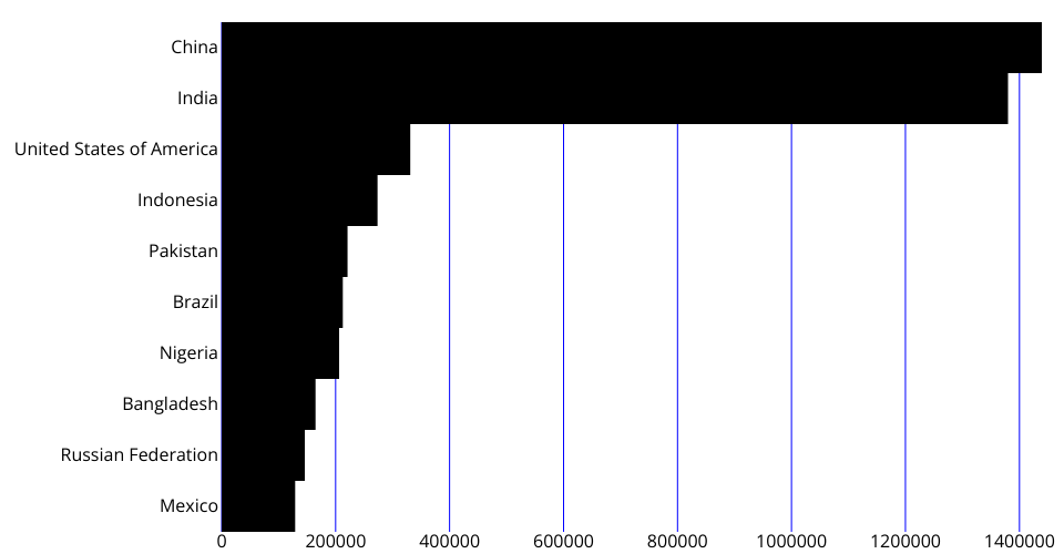 A program that shows the top 10 most populous countries as a pathetic bar chart with no axes.