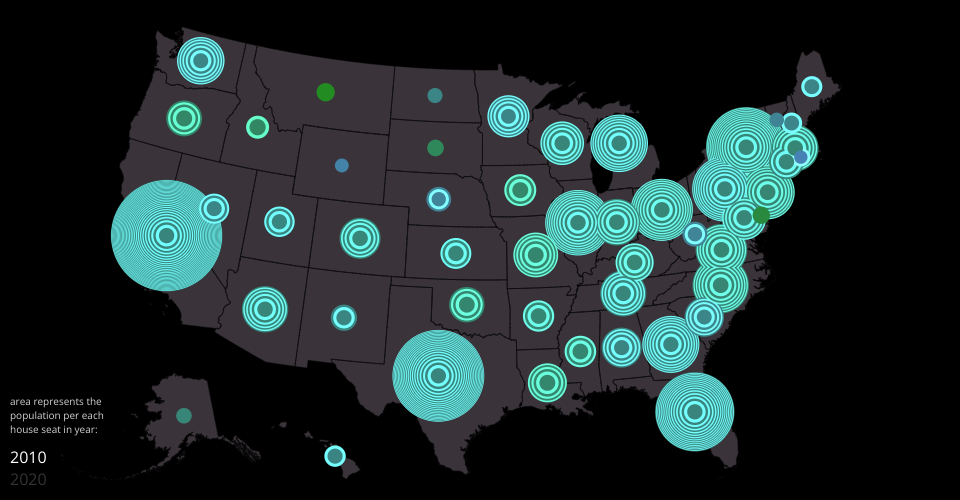 The overall size of the circle for each state represents the total population of the state. The rings within each circle show the number of representatives for that state (such that the amount of area covered by each ring is proportional to the number of people represented by each house seat). Thus, larger rings show cases where the state has more than the average number of people per seat (most noticable by looking at the different sizes of the innermost ring). So in 2010 Montana was one of the most underrepresented states (it had the most people per house seat) but in the 2020 reapportionment it is now one of the most overrepresented.