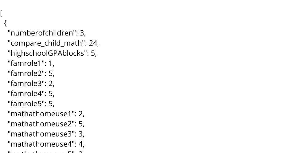 - 'mathathomeuse1' :’ mathathomeuse52' - responses on 52 questions about regularity of doing 52 different math actitivies with their kids, parents answered on a likert scale from 0 to 5. Ordinal.
