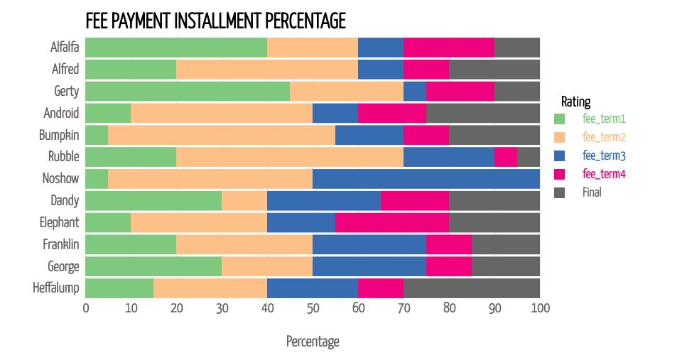 This Stacked bar chart gives the percentage of total fee payment in each fee term by students. The aim is show the data on how much a each candidate is paying at the given point. when the mouse hovers over each bar, ypu can see pop=up of accurate percentage of each amount paid by a student at each term.