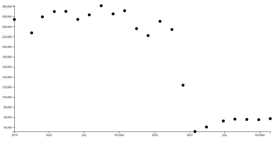 An quick look at Golden Gate Transit's total monthly ridership from 2019-2020 in an effort to observe the drastic reduction in ridership due to COVID19: GGT Ridership.