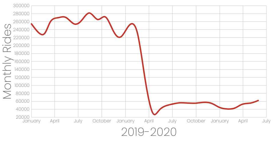 An quick look at GGT ridership from 2019-2021 in an effort to observe the drastic reduction in ridership due to the COVID19 pandemic: GGT Ridership.