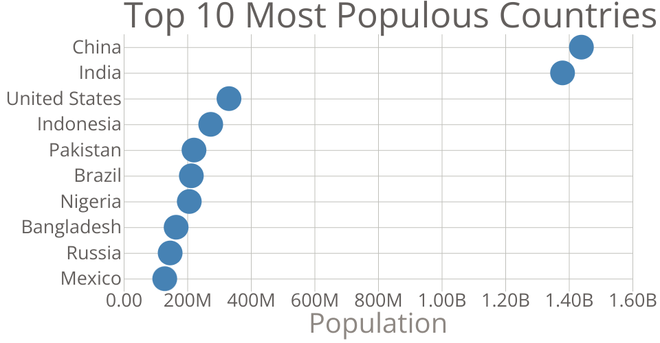 This bar chart shows the population of the top 10 most populous countries . The data comes from the year 2020 estimate in United Nations: World Population Prospects 2020.