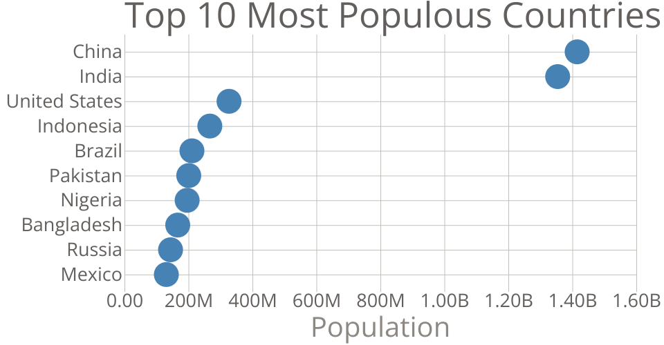 This scatter plot shows the population of the top 10 most populous countries. The data comes from the year 2018 estimate in United Nations: World Population Prospects 2017.