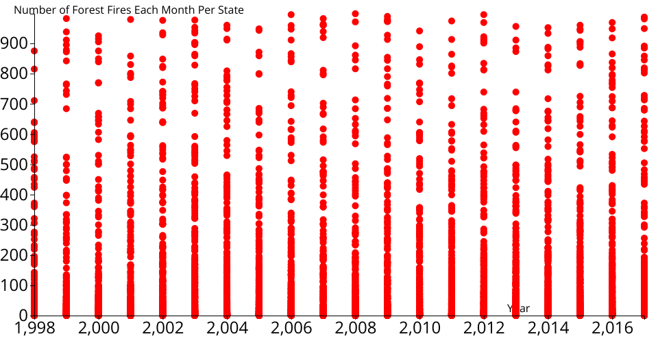This is a scatter plot using the Brazilian Forest Fires Dataset and depicts the amount of forest fire each month per Brazilian state. Each point represents a Brazilian state and its height is the number of forest fires that occurred that month.