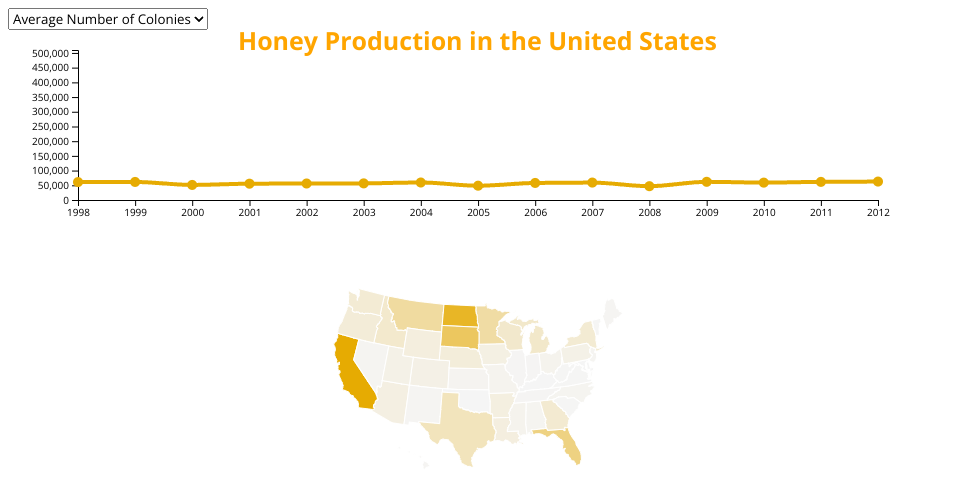 This is the final iteration of my final project: it is a combination of my Average Honey Production in the United States Map and Interactive United States Honey Production per Year Line Graph. All previous progress can be found on my CS 573 - Data Visualization Project Proposal.
