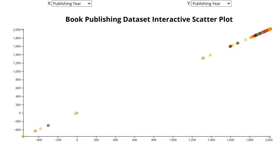 This is an interactive scatter plot based on my Book Publishing Dataset. Each book (represented by a point) is colored based on its publisher. You can see the book's title, author, publisher, and related information by hovering your mouse its' point.