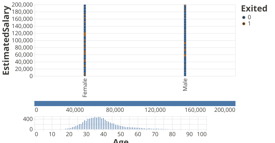 This visualization shows the salary vs gender plot for a company. Choose a salary range and you can see which customers male/female fit the given range of salaries.