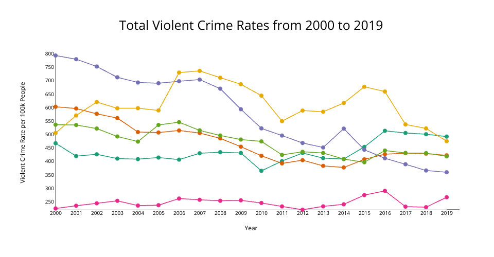 Visualization of crime rates (per 100k people) by state from the CORGIS dataset made with D3. Color legend and threshold code from Susie Lu. Implementation from D3 Graph Gallery.