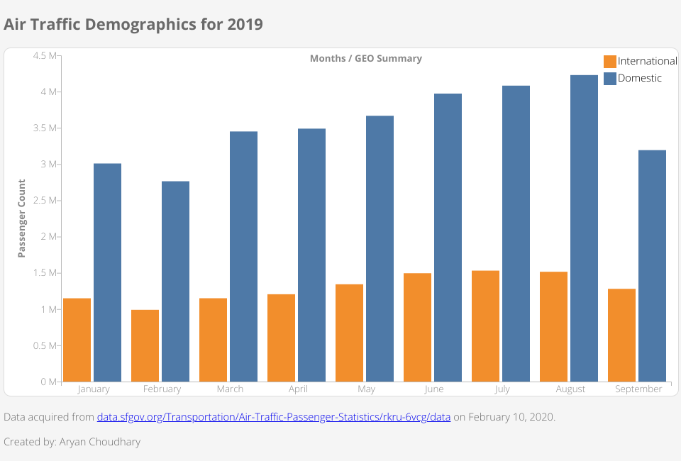 The above bar chart shows the number of passengers boarding to flights from the San Francisco International Airport in a month. The data is from January, 2019 to September, 2019. The passenger count per month is also separated based on the type of flight they are boarding, i.e. "Domestic" or "International".