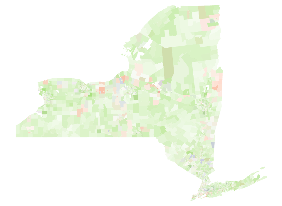 An intermediate state on the way towards trying to visualize multidimensional data for census tracts. The more green it is, the more white people there are.