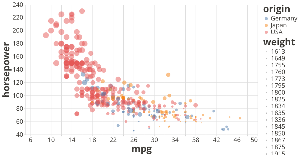 The data shown here comes from the UCI Machine Learning Repository: Auto MPG Data Set, via Gist: Scatter Plot with Menus.