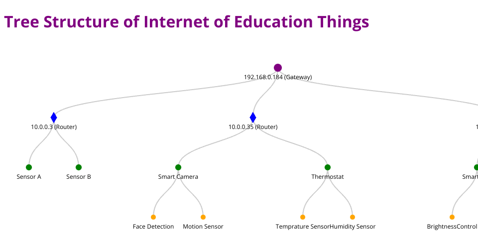 This hierarchical tree represents an IoT (Internet of Things) architecture deployed in an educational environment. The visualization demonstrates how smart devices, sensors, and control units are structured and interconnected through a layered network, beginning from a central gateway down to the smallest functional units like individual sensors.