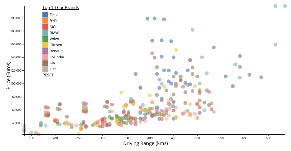 Each point on the scatter plot represents a different electric vehicle model, with distinct colors indicating different car brands. The visualization aims to provide insights into how the driving range of electric vehicles correlates with their price, offering potential buyers a visual comparison among various models. By hovering over any point on the plot, users can see additional details about each vehicle, such as the brand, exact driving range, and price, enhancing the interactivity and informational value of the graph.