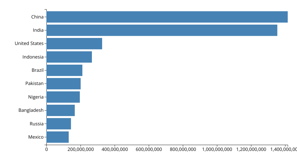 This bar chart shows population of the top 10 most populous countries. The data comes from the year 2019 estimate in United Nations: World Population Prospects 2019.
