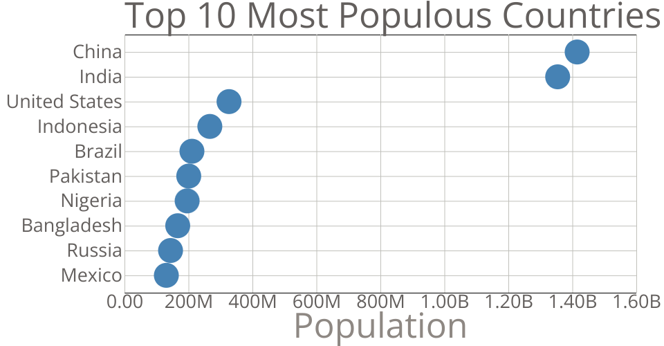 This bar chart shows population of the top 10 most populous countries. The data comes from the year 2018 estimate in United Nations: World Population Prospects 2017. It also demonstrates customization of D3 axes.