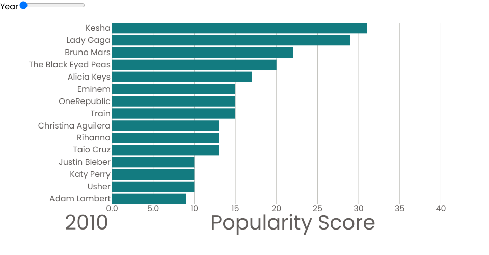 An interactive Bar Chart showing the top 15 singer of Spotify from 2010-2019 in U.S. The popularity score in each year of every artist is the sum of all the rank score of their songs. Just simply slide the year to see the change and move the mouse over the bar to see the exact score.