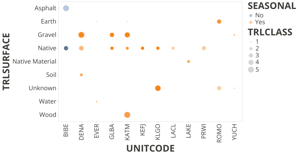 This visualization shows surface of the trails in national parks. The more opaque the dot is, the larger amount of that class trail in one national park. Dot size shows the wellness of the trail, class 5 means the trail is completely well developed, and class 1 means that is barelt developed.