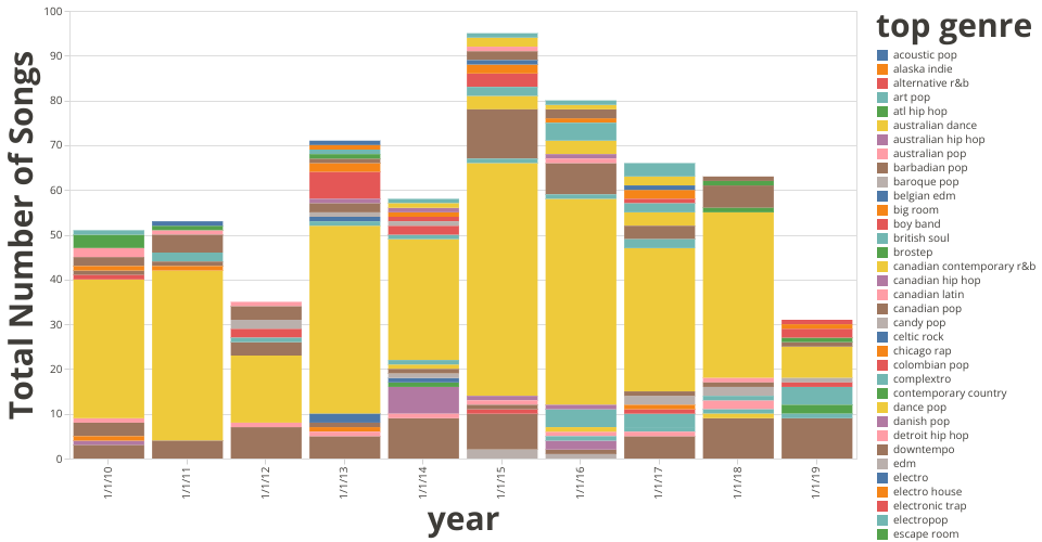 The stacked bar chart shows the different top genre distribution of the most popular songs in each year.
