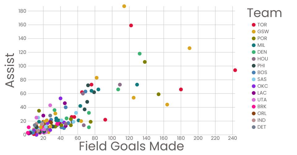 - The scatter plot shows the Field Goals Made vs. Assist, each dot represents for one player, and the different colors are assigned as their team.