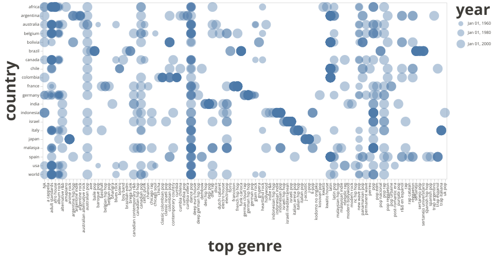 This visualization is the scatter plot of the top genre vs the country where people play those music on Spotify. Darker color of the spot means the more frequent that people are listening to that type of music. The size of the spot indicates the releasing year of that song.