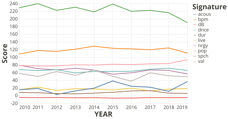 The graph shows the trend of music component signature since 2010 to 2019. Data were preprocessed by Rstudio, taking the average data of top 10 Spotify playing music every year. Standard deviation is calculated to show the variant of each category.